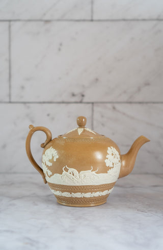 Late 19th Century Copeland England Brown Jasperware Teapot with Fox Hunting Scene