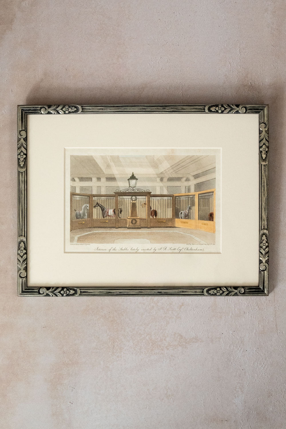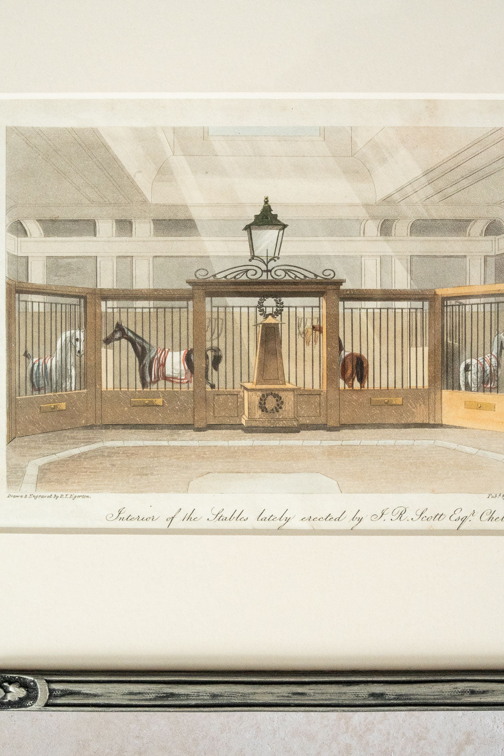 This 200+ year old first-edition colored aquatint is captioned "Interior of the Stables lately erected by J.R. Scott Esq. Cheltenham" and was engraved by D.T. Egerton and printed by Sherwood, Neely & Jones in England in 1822. This is a piece that I almost kept in my personal collection after finding it at a high street antique print shop in the Peak District last fall. I love the bright, airy stable scene depicted, with each of the horses sporting white and red blankets.