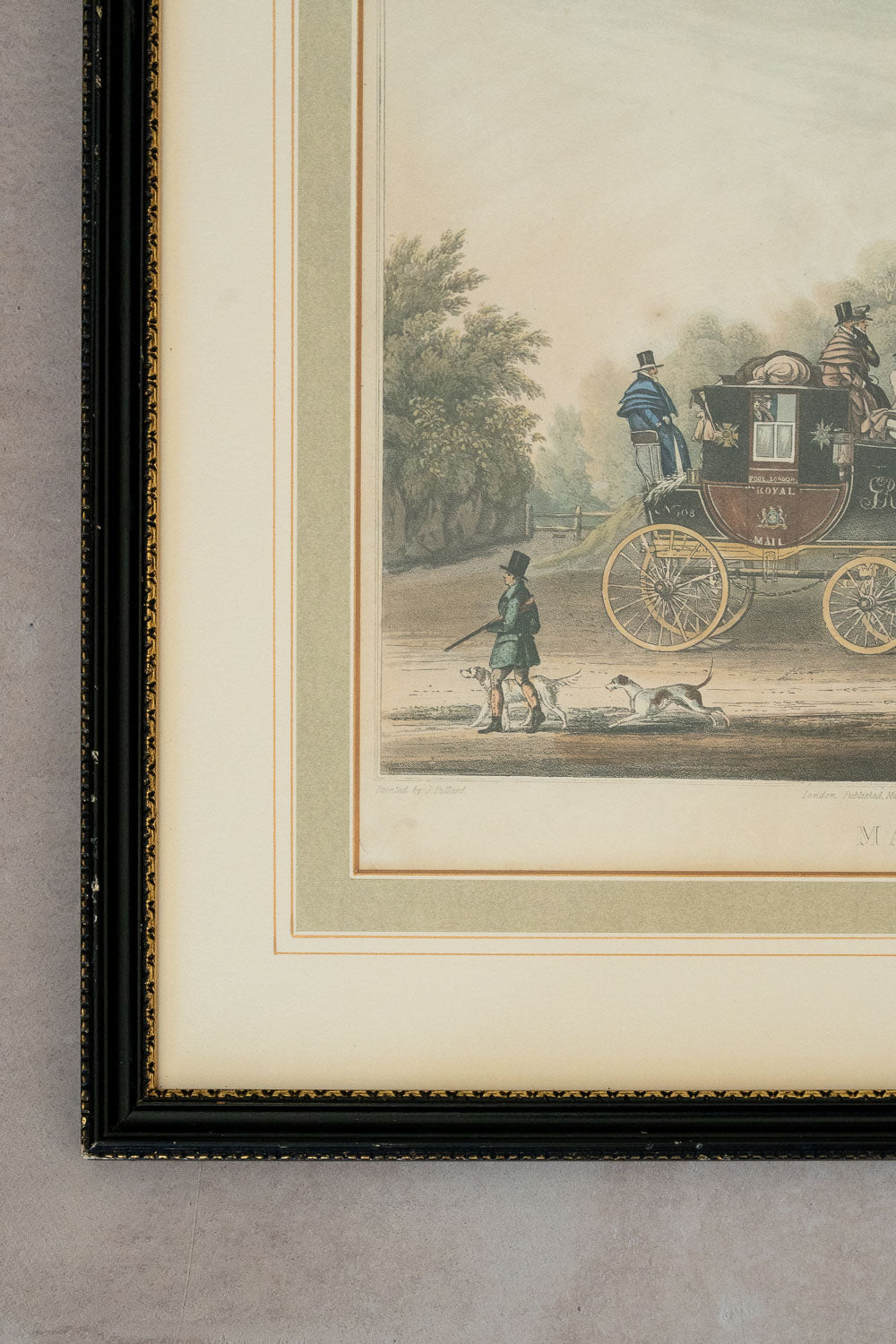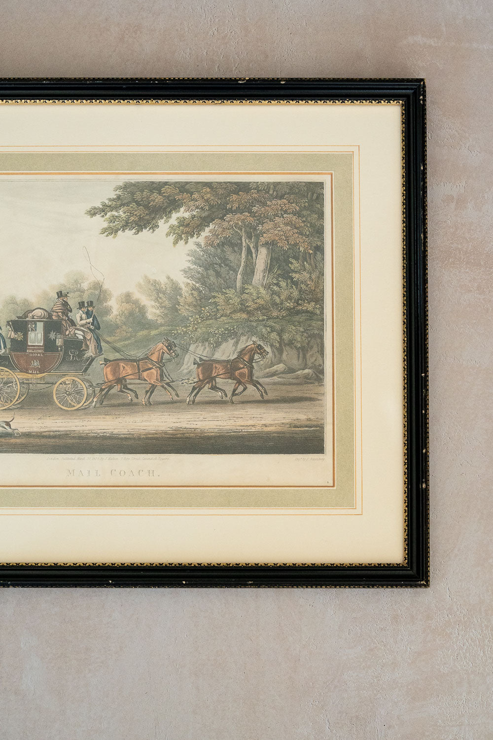 This beautifully hand-colored engraving, titled "Mail Coach" and printed in London, England in 1829, is after a painting by British sporting artist James Pollard (1792-1867). The colors in this piece are really lovely. The coaching scene, sent on a lush wooded turnpike, features a team of four horses pulling a Royal Mail Coach filled with well-dressed occupants.