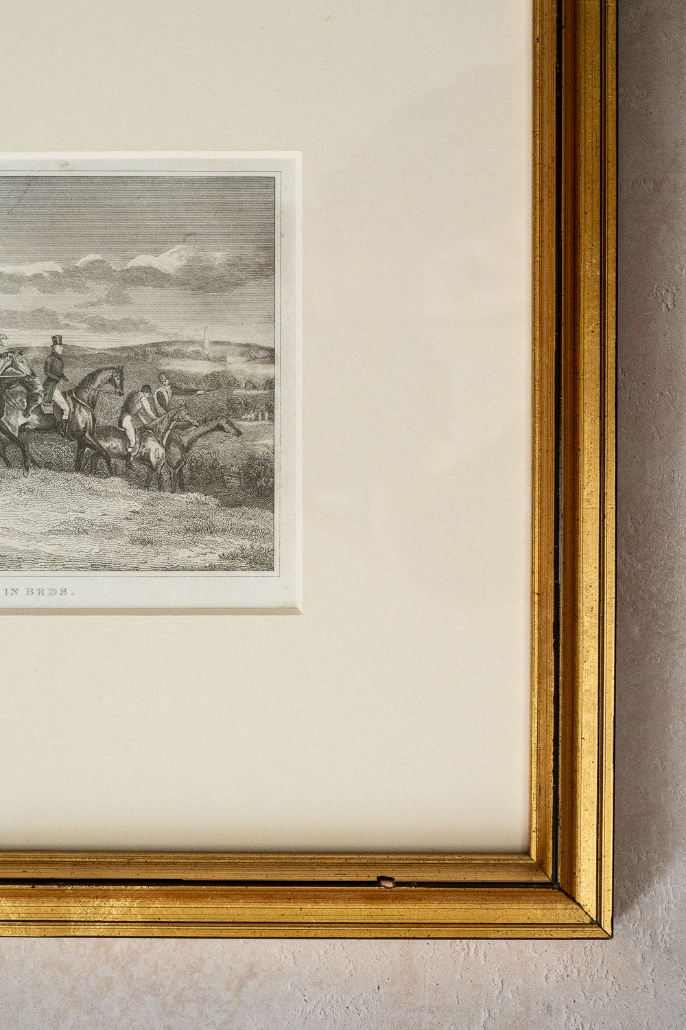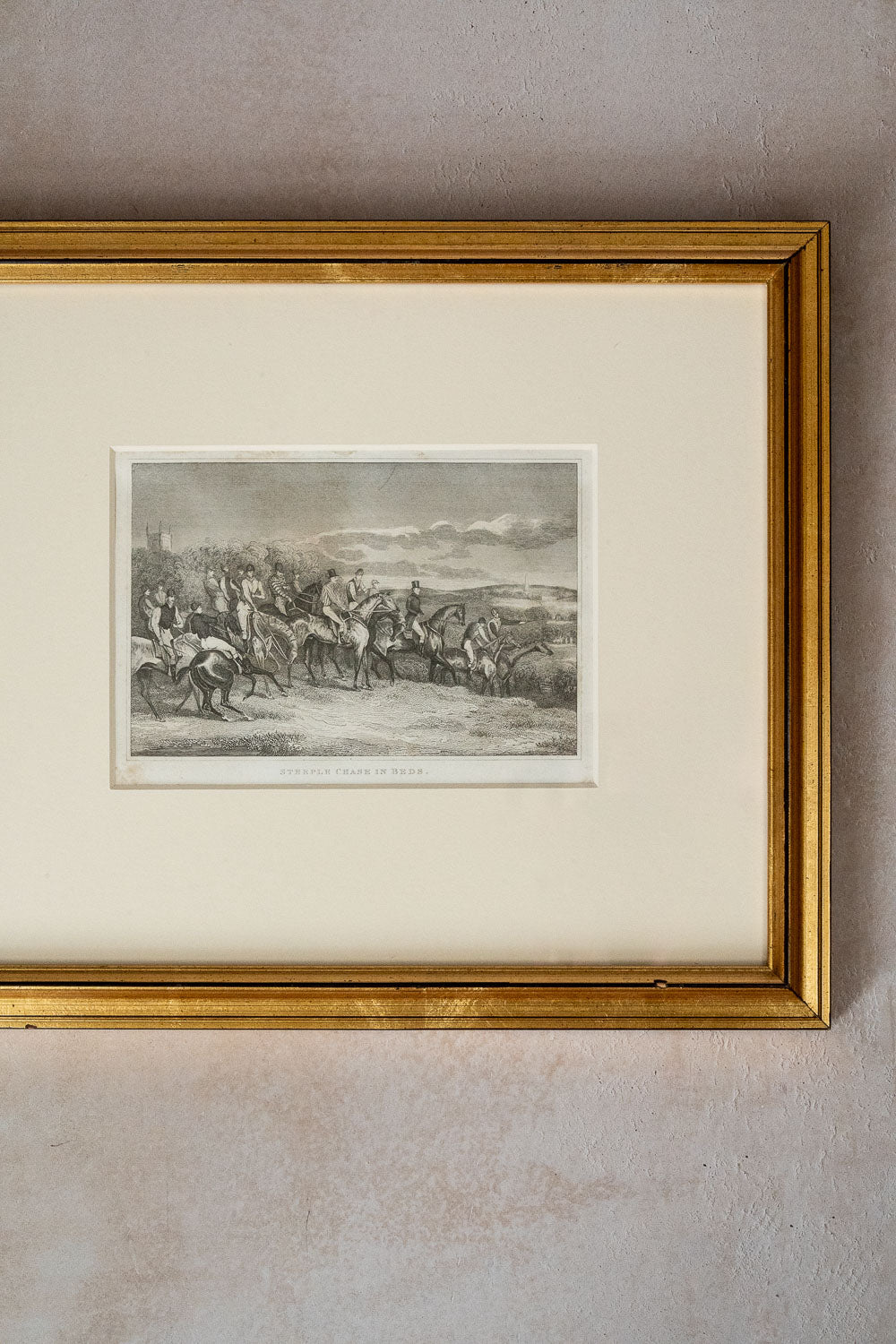This intricately detailed engraving, titled "Steeplechase in Beds" and printed in England in 1840, features a group of over a dozen horses and jockeys in the countryside. I love the dramatic, energetic gestures of both horses and riders. It is a lively piece that instantly caught my eye at a high street antique print shop in the Peak District last fall.