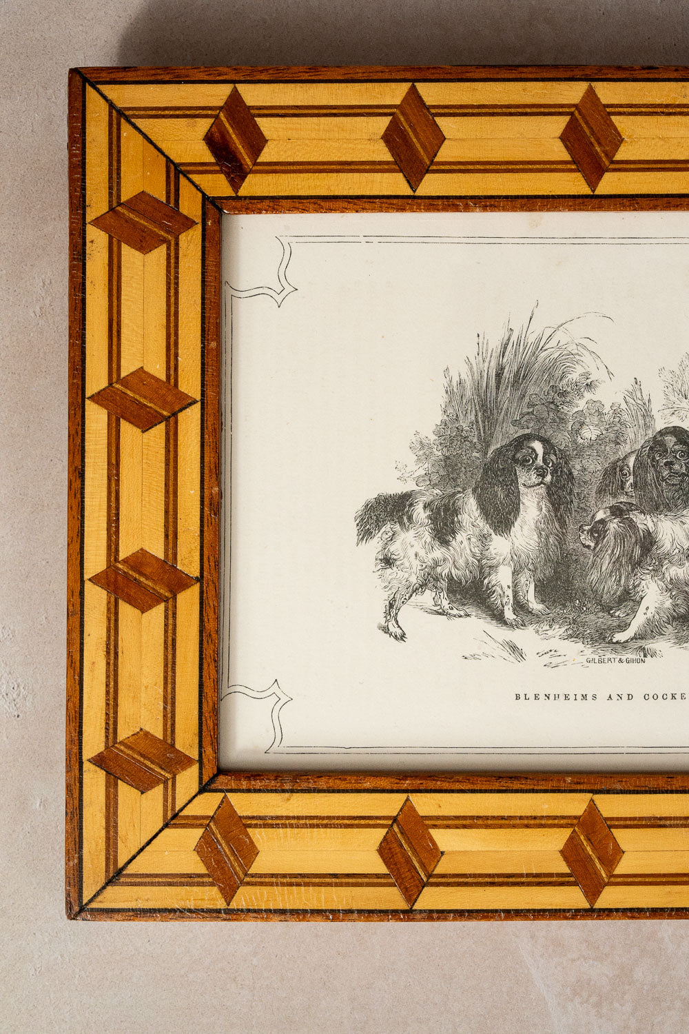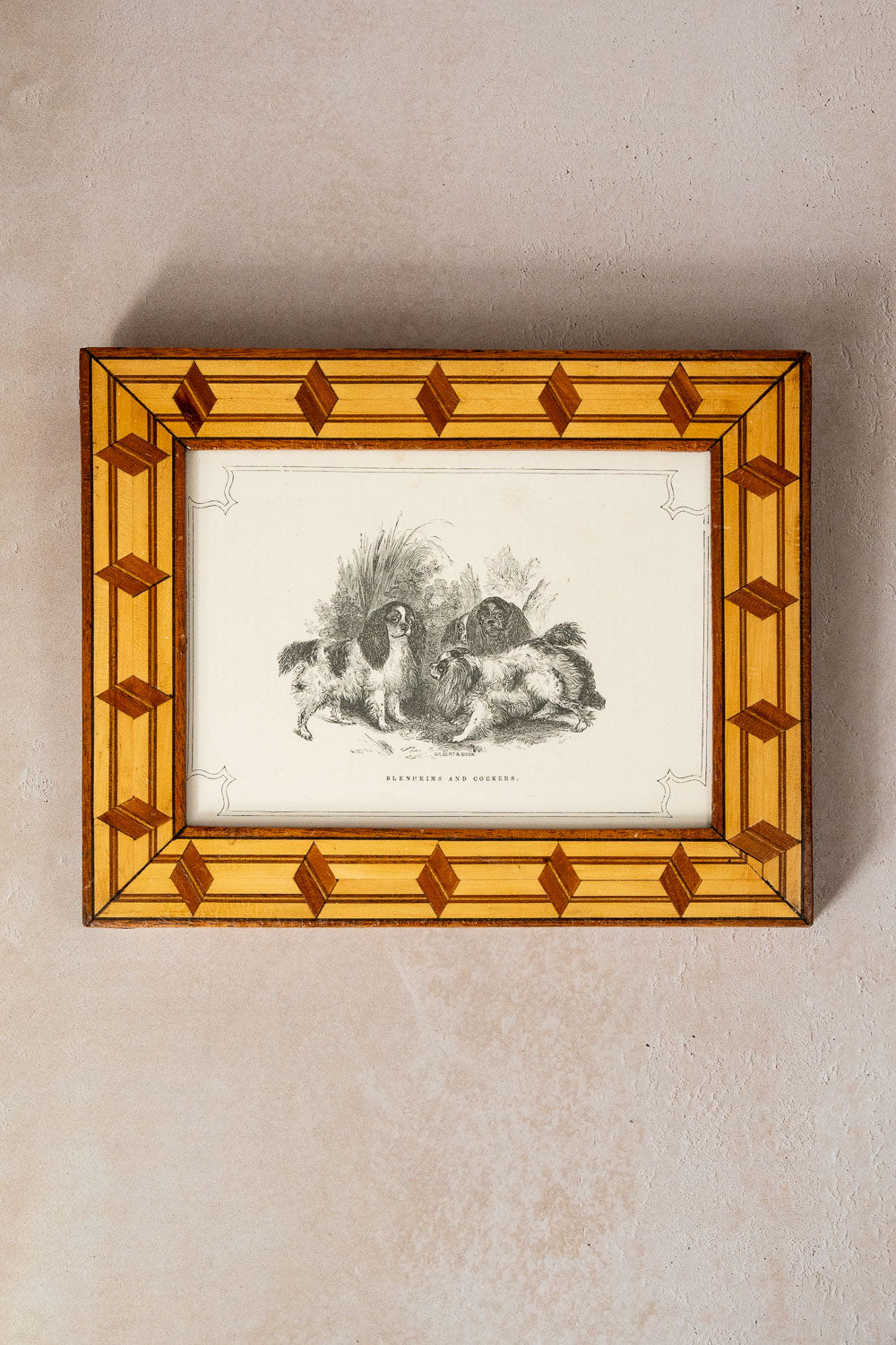 This sweet engraving of Blenheim and Cocker Spaniels captures the breeds' characteristics perfectly. And, perhaps just as special as the engraving, is the antique frame it is housed in. Incredibly ornate, the frame features diamond and arrow design inlays in various wood tones.