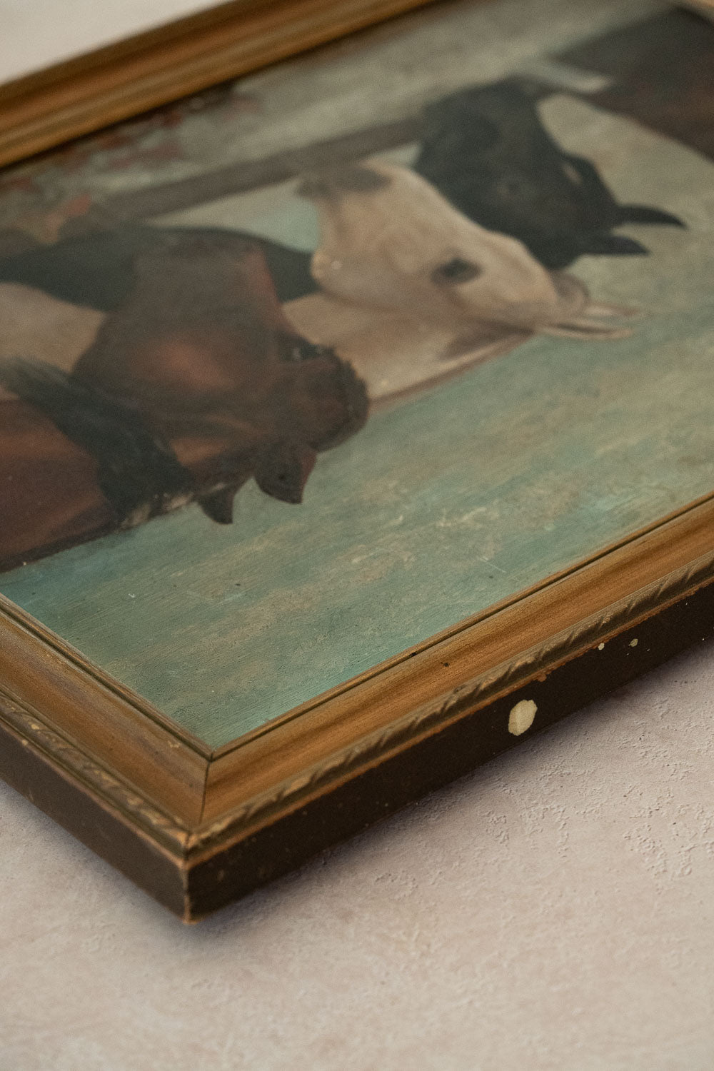 The timeless scene depicts three horses drinking from an ivy covered stone water trough. The way the artist has painted the horses fills the piece with personality and charm.