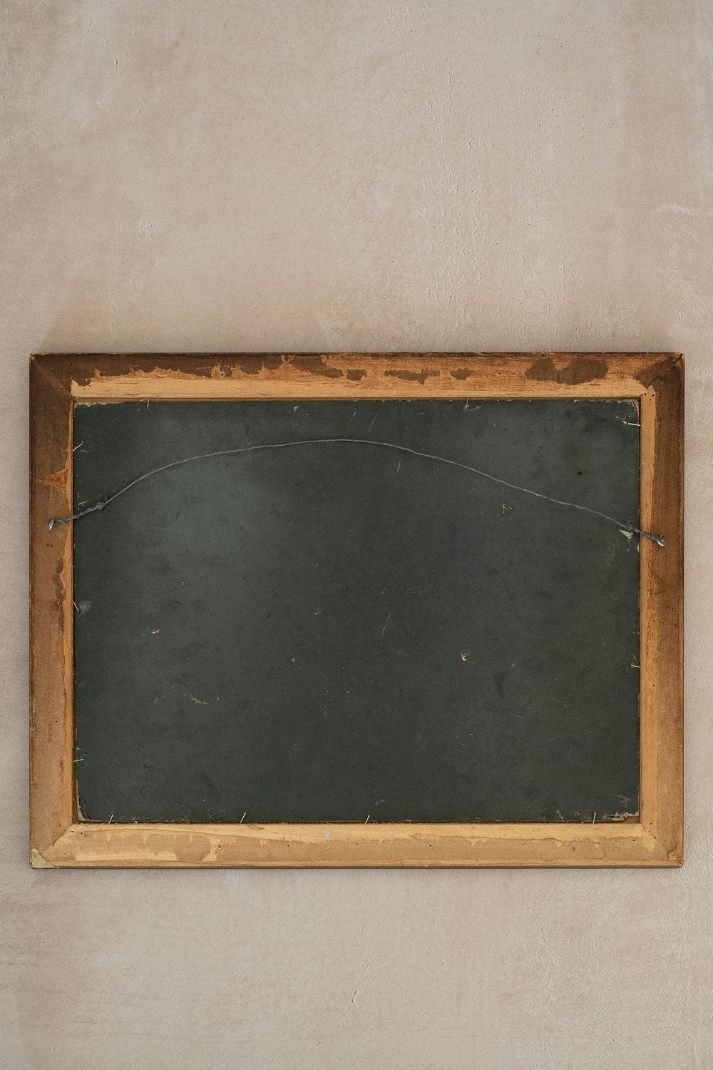 This oil painting on board is in fair condition. There are scratches to the surface – particularly around the edges of the piece (most likely from an older frame). The painting has darkened with age. The frame is in good condition, with some white paint spots on the top edge, some areas of wear to the finish, small scratches, and dents throughout.