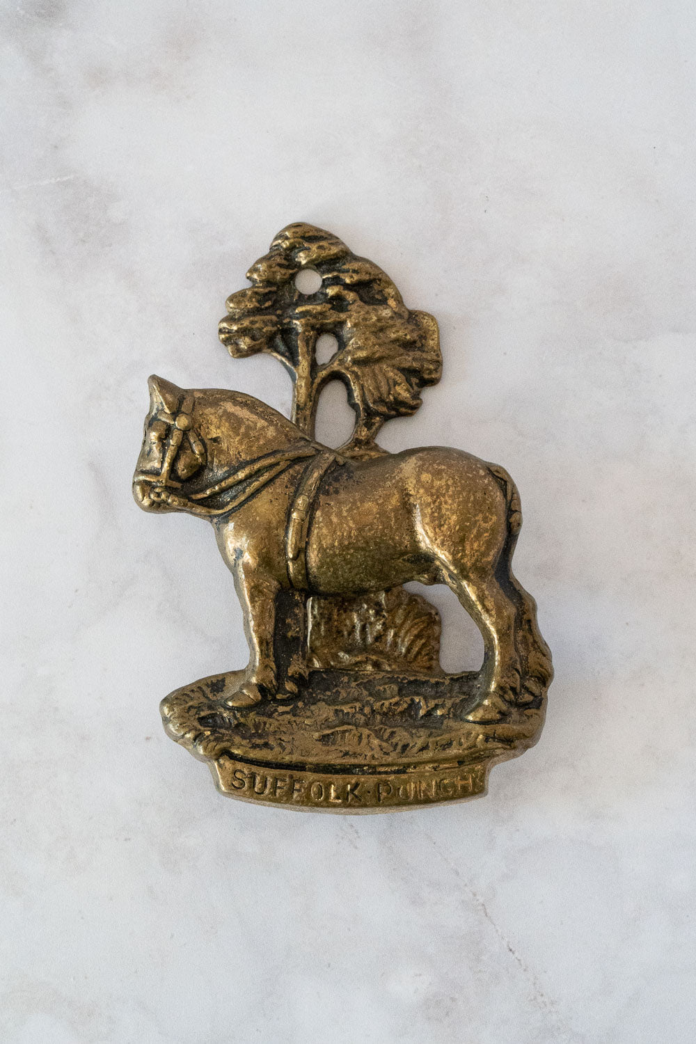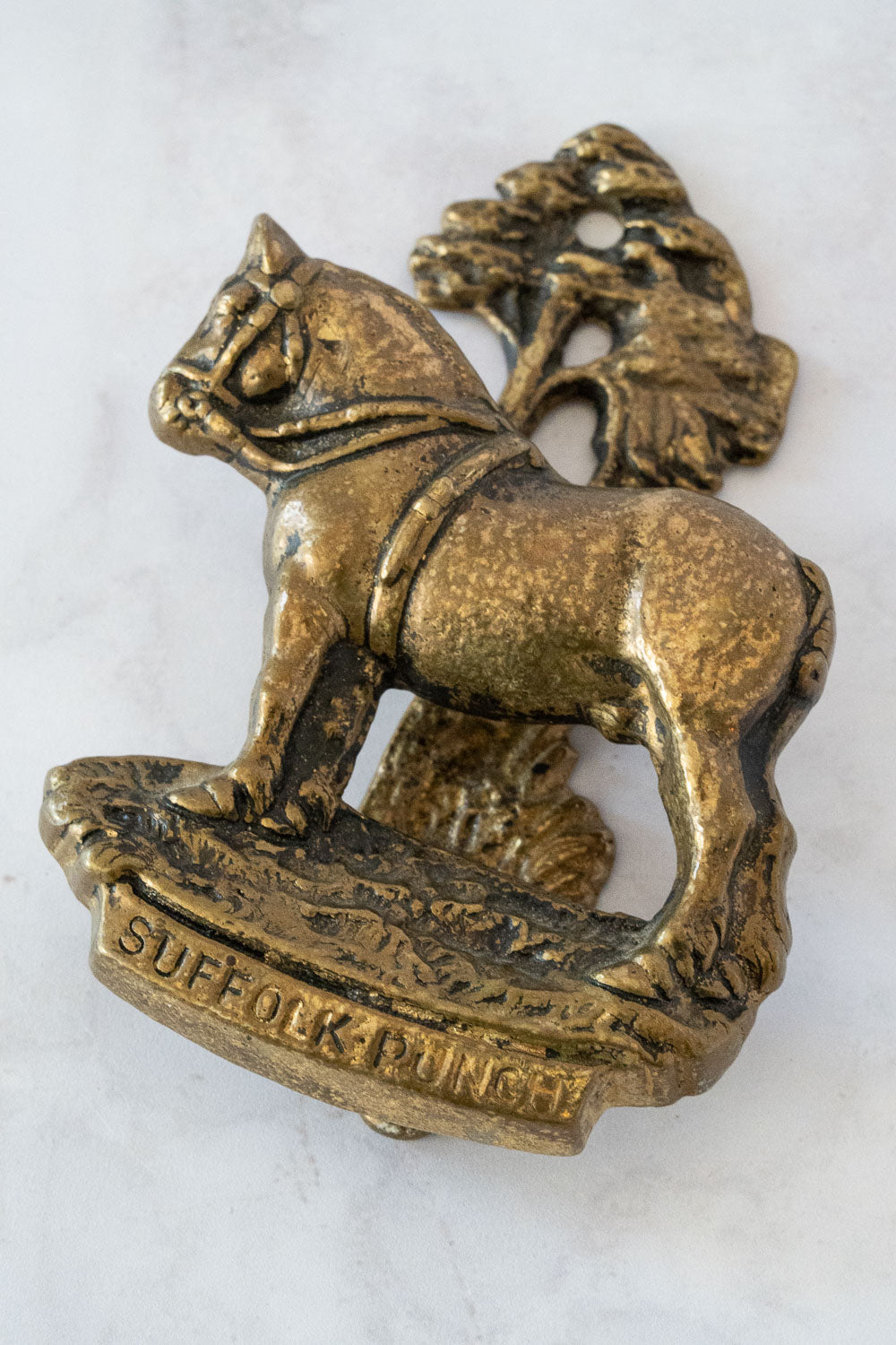 This door knocker is solid cast brass and features a Suffolk Punch horse design with a strike plate in the form of a tree.