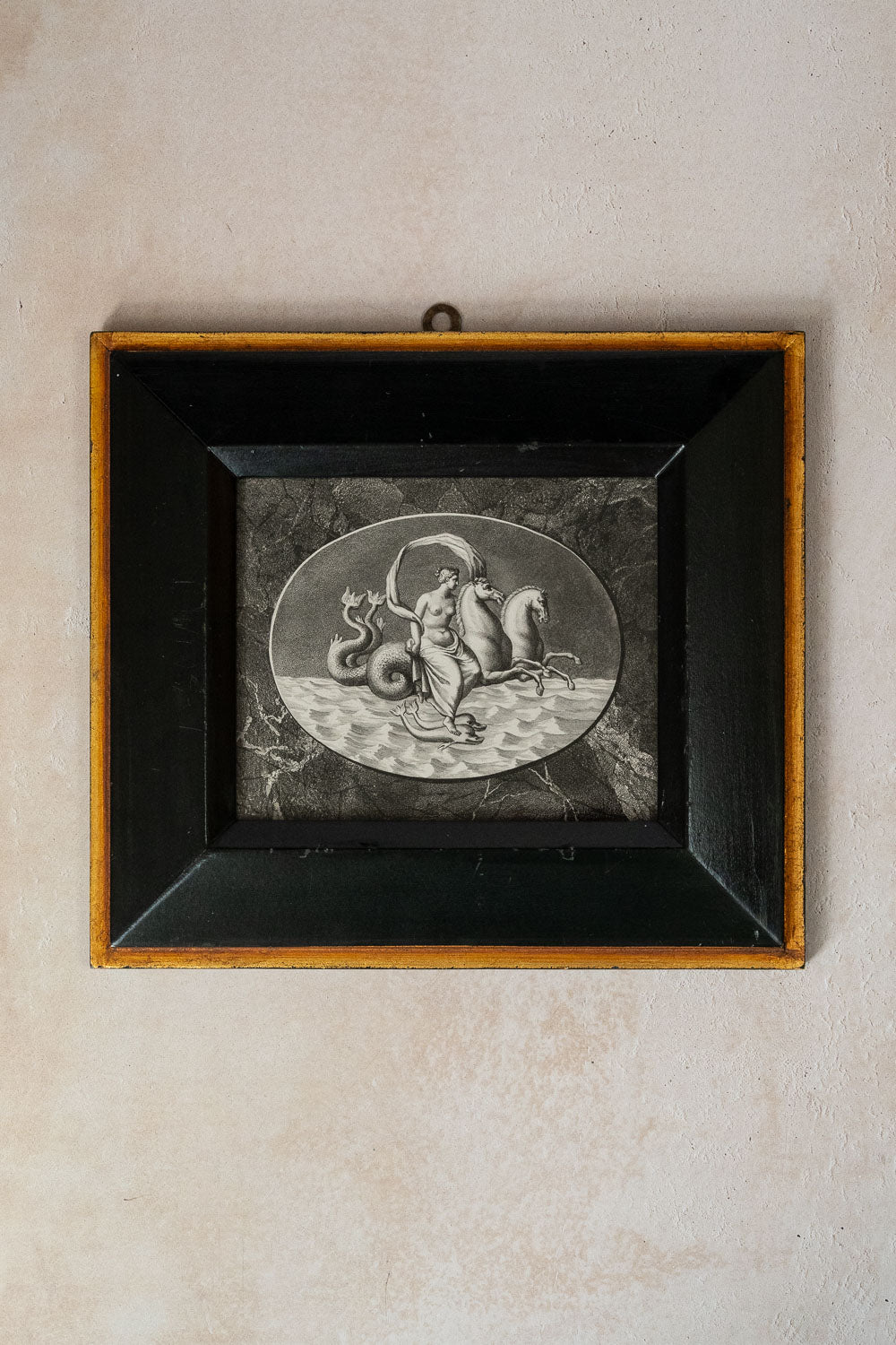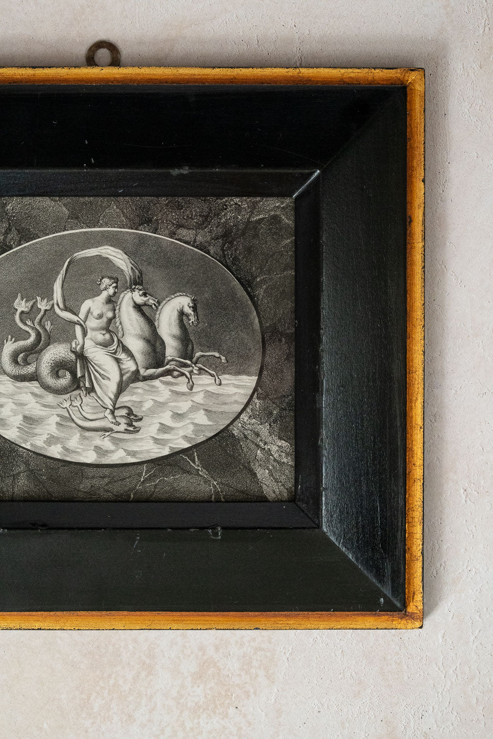 This Neoclassical style engraving depicts a scene from Greek mythology. Galatea, a Nereid (sea nymph), is pictured seated upon Hippocampi (sea horses) and accompanied by dolphins. This engraving is incredibly detailed with fine, beautiful line work.