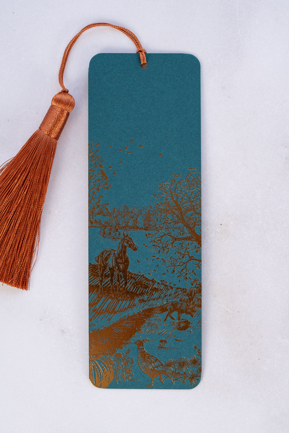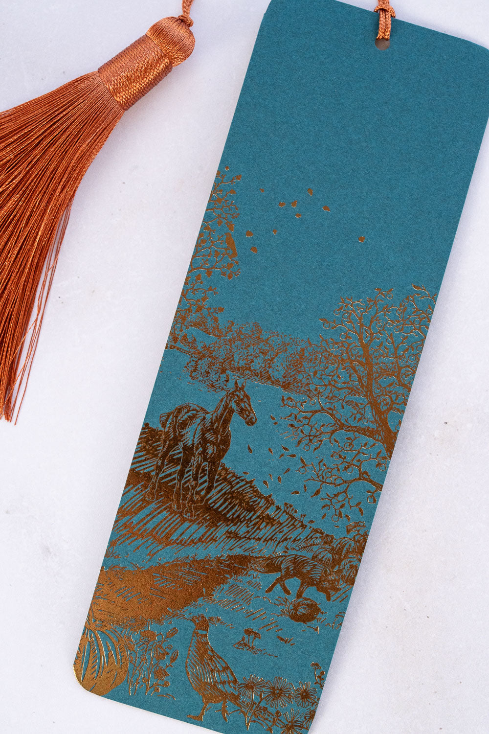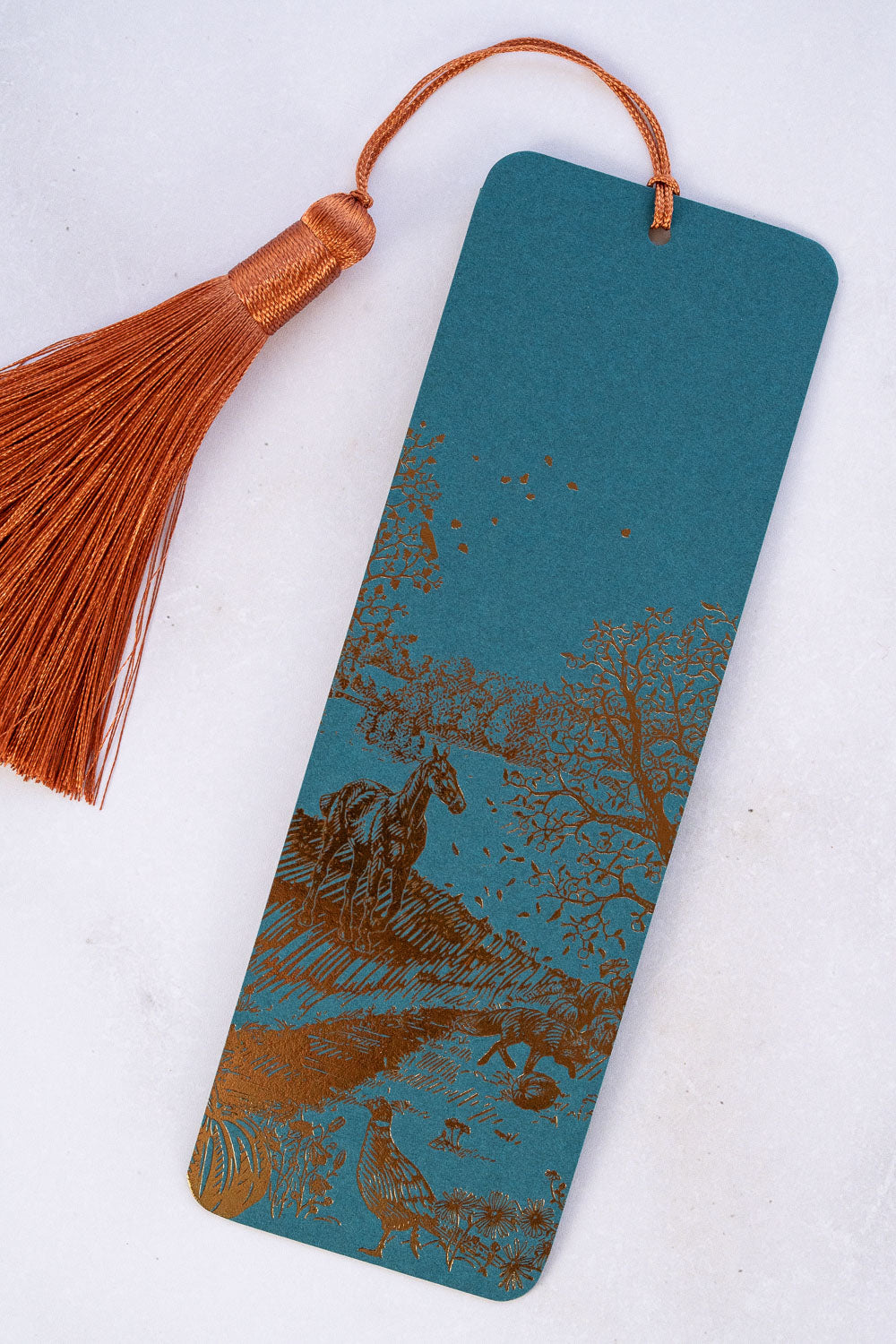Each bookmark is foil-stamped by hand in metallic bronze on dark teal 111lb card stock and finished with a beautiful spiced orange tassel.
