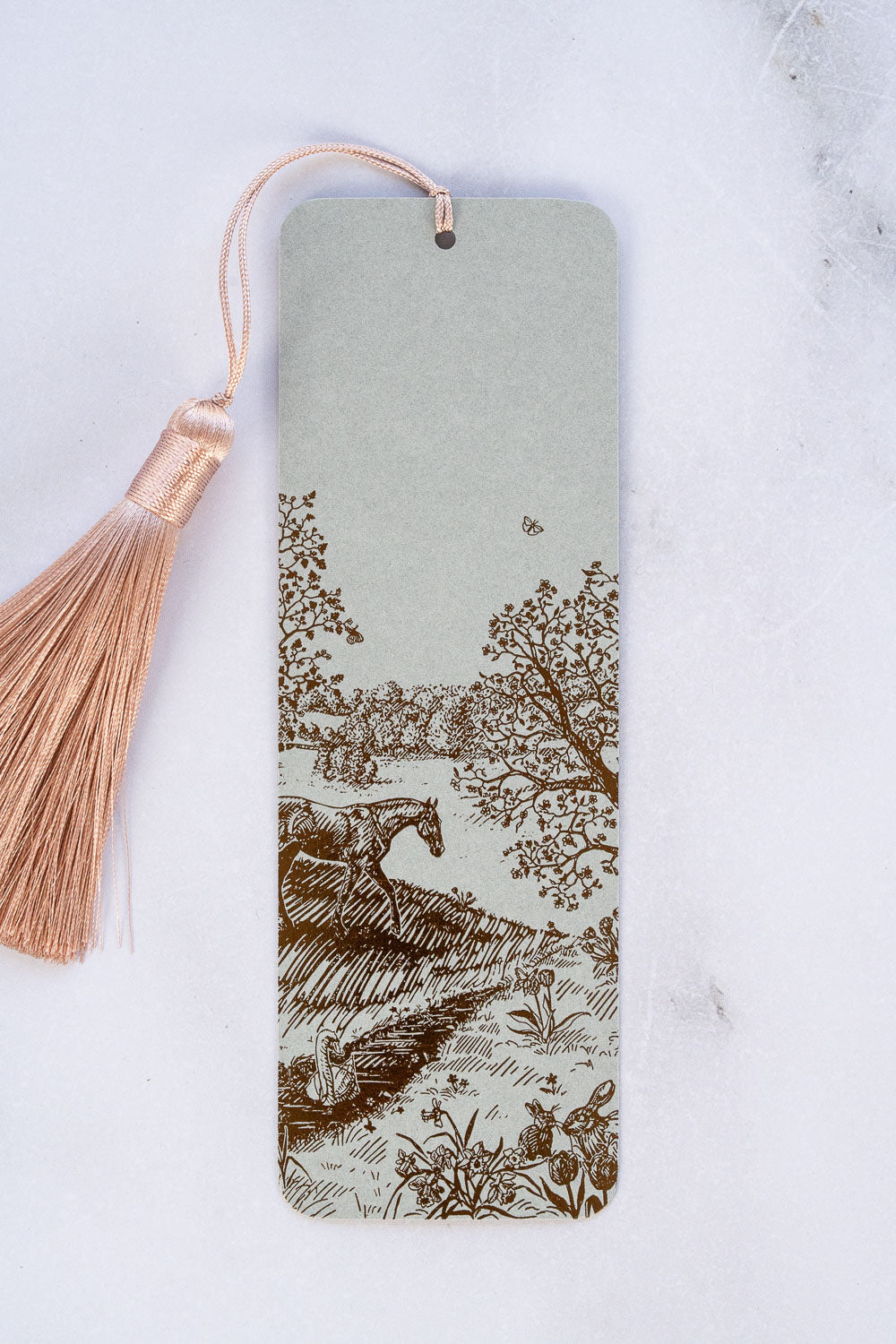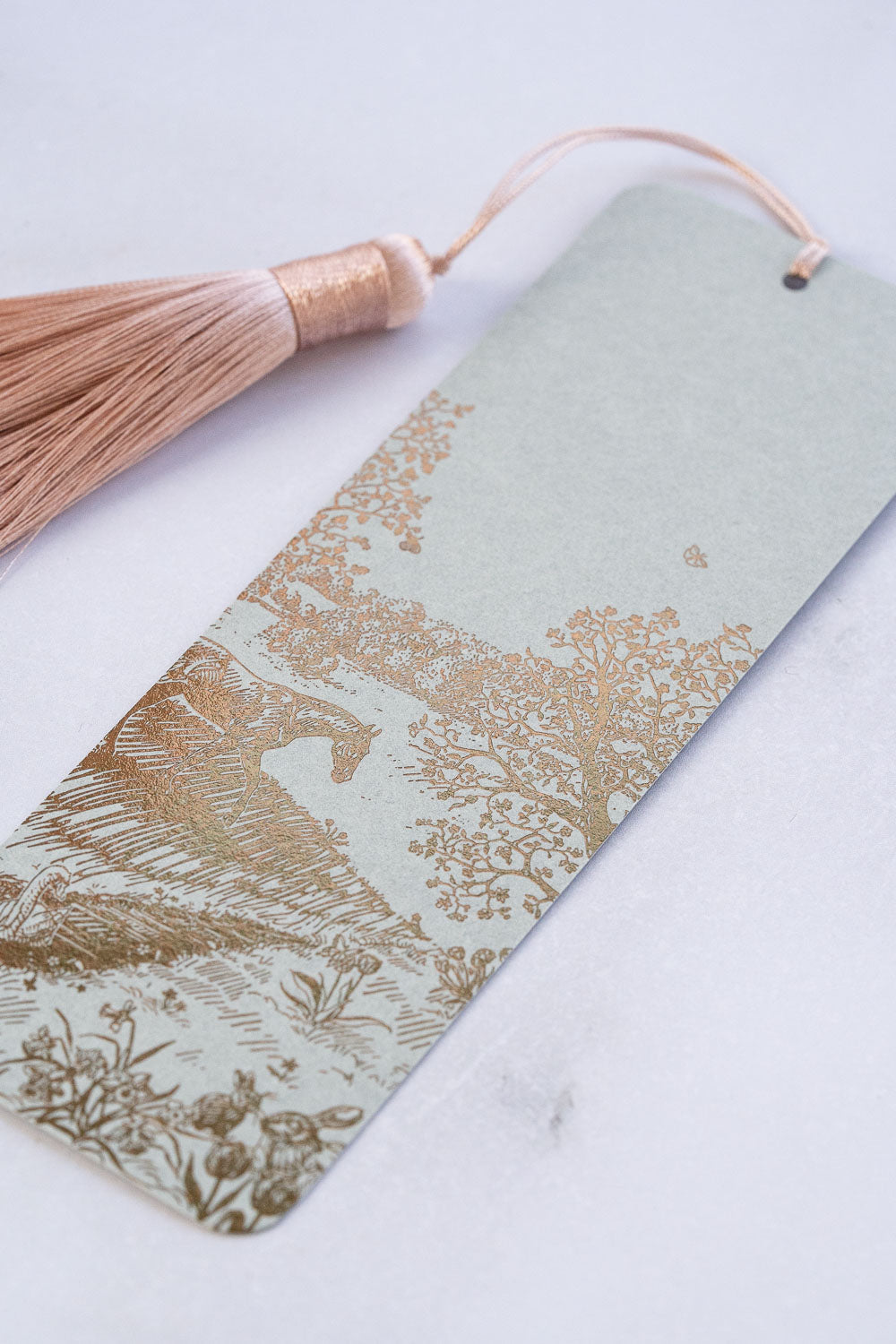 Each bookmark is foil-stamped by hand in metallic bronze on muted sage 111lb card stock and finished with a blush pink tassel.