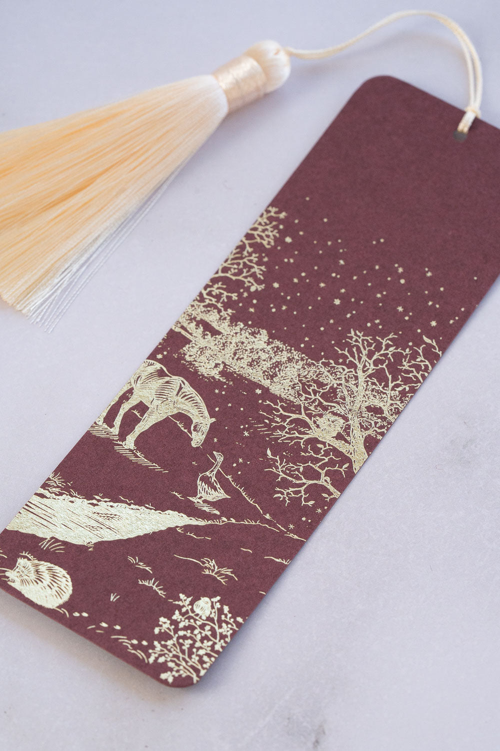 Each bookmark is foil-stamped by hand in metallic gold on plum 111lb card stock and finished with a cream tassel.