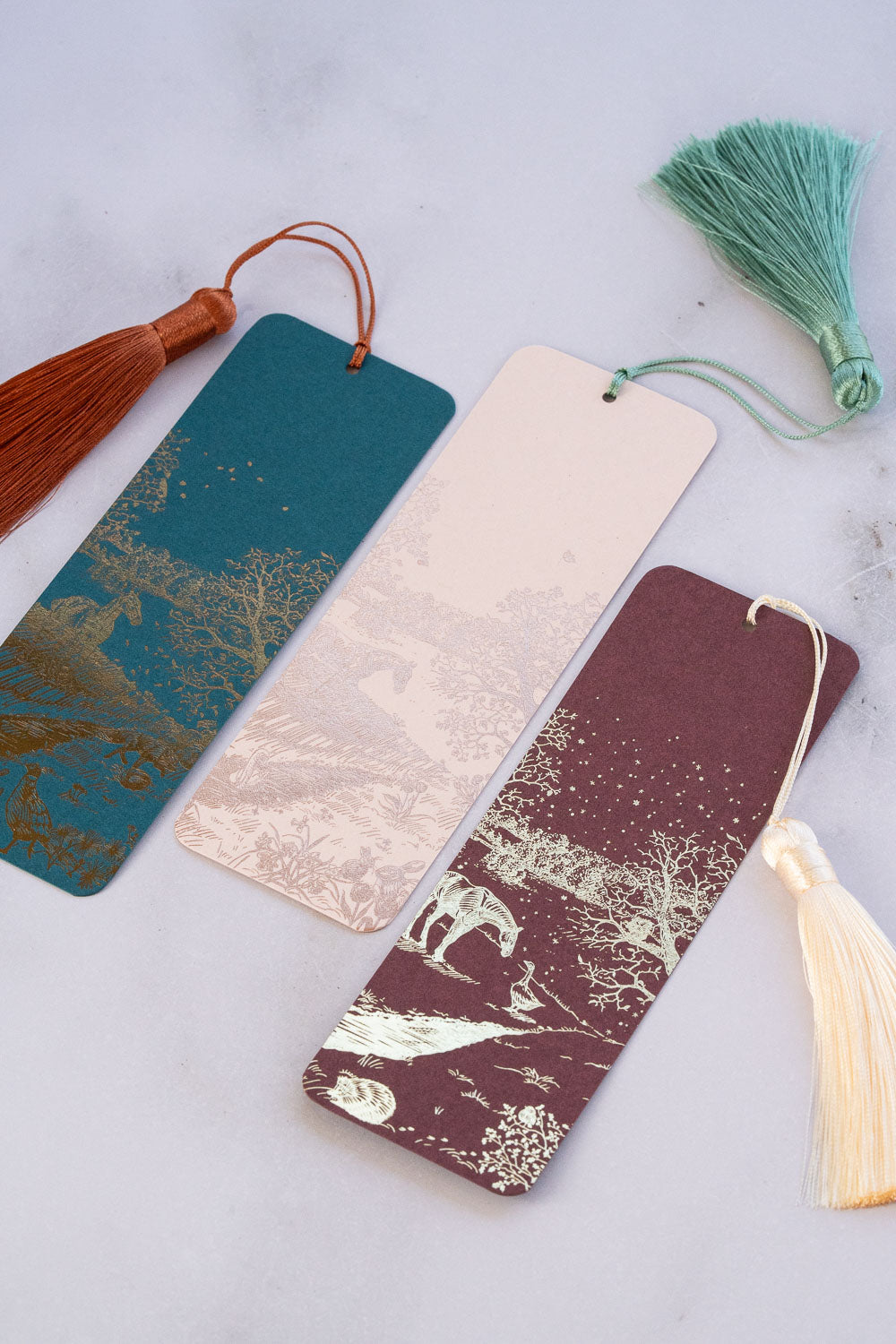 Each bookmark is foil-stamped by hand on 111lb card stock and finished with a tassel.