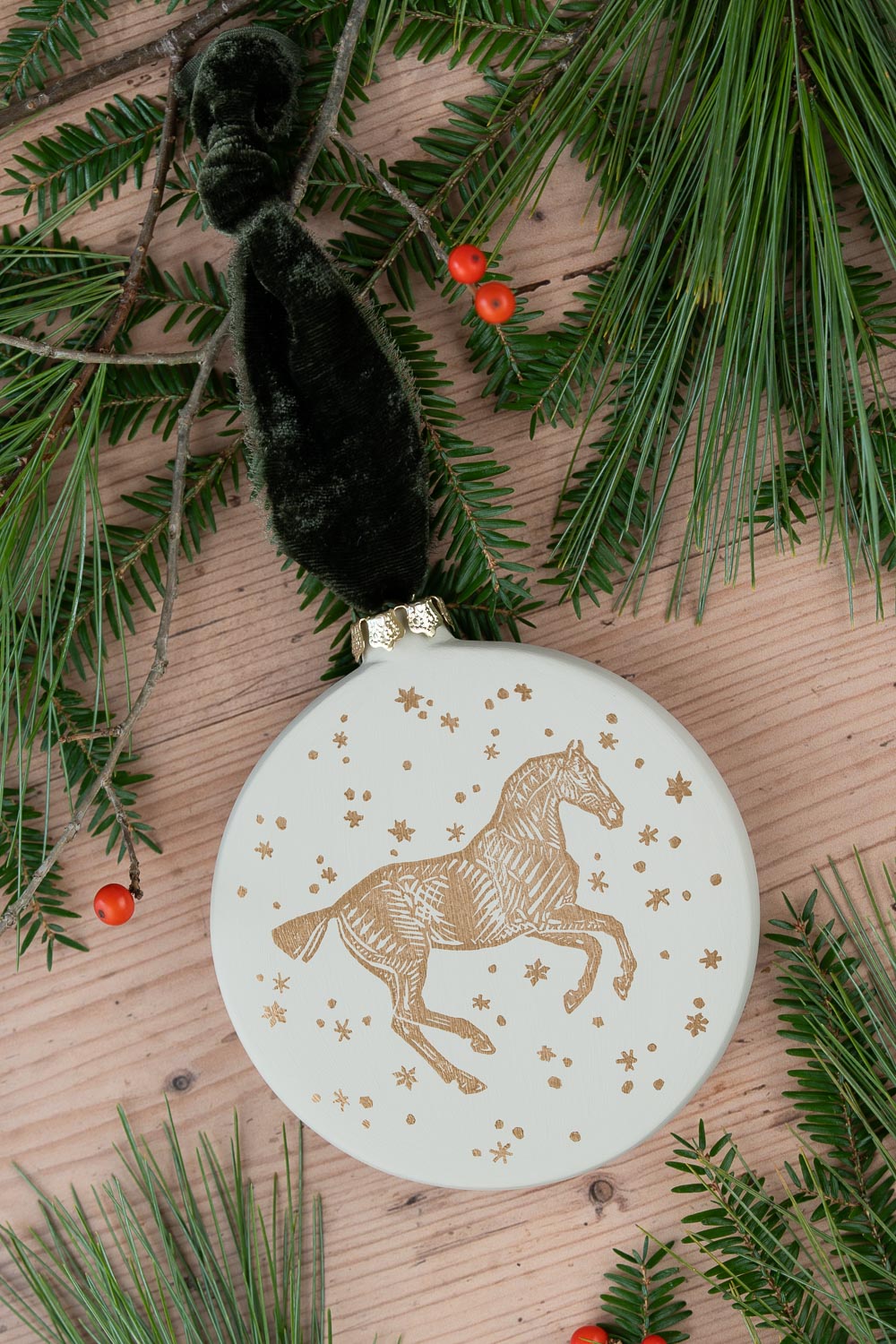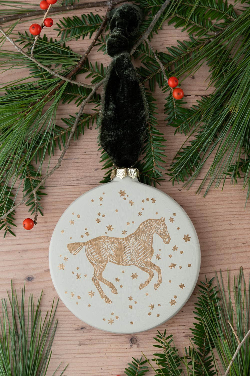 Each ornament is painted in Candlewick off-white, then hand block printed in rich metallic gold ink and finished with a raw-edge dark olive silk velvet ribbon.